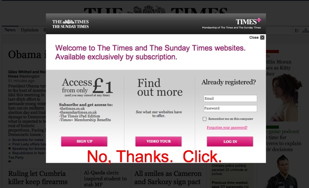 But what did the Times lose? According to comScore, the Times UK website saw its online readership decline by 4 million unique visitors a month worldwide to 2.4 million, or a 62 percent drop. Pageviews fell off an even steeper cliff, plummeting 90 percent from an estimated 41 million in May, 2010 to 4 million in September, 2010. People did what you’d expect them to do when faced with a paywall at a news site. They said, “No, thanks” and clicked away to another site.