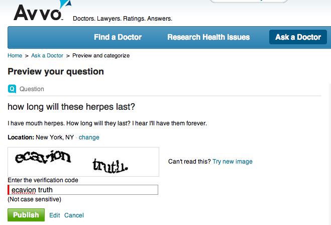 The site also offers free medical advice in addition to its free legal advice. Again, while I trust Angie to steer me right when it comes to folks who can clean up my gutter, I’m loathe to trust free medical advice on the Internet. That said, the service is free, anonymous, and could be a good first step for those with weeping sores, etc.
