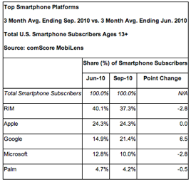 RIM was the leading mobile smartphone platform in the U.S. with 37.3 percent share of U.S. smartphone subscribers (down 2.6 percent from the previous period), followed by Apple with 24.3 percent share (which didn’t rise or fall from the previous period). But Google continued to gain ground rising 6.5 percentage points to capture 21.4 percent of smartphone subscribers. Microsoft accounted for 10.0 percent of smartphone subscribers, while Palm rounded out the top five with 4.2 percent.
