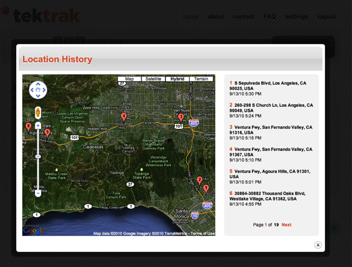 TekTrak offers its location-tracking app for $4.99, in the Apple App Store. The App’s functionality is fairly simple: it allows an iPhone’s owner to access their device’s location information in realtime from a browser. You can access all the location history of your phone (i.e. where it was and when); and the app runs in the background. You can also remotely ring or send push notifications to your phone.