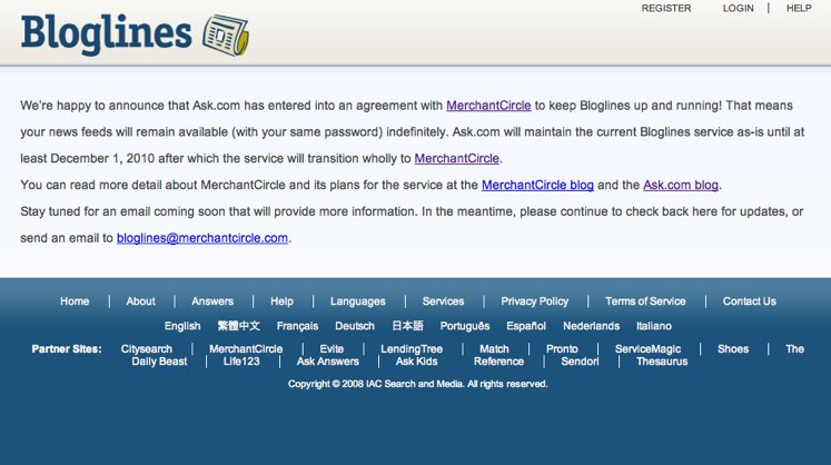 Timing: Ask.com will maintain the current Bloglines service as is until December 1, 2010. After December 1, 2010, the service will transition wholly to MerchantCircle. During the month of December, you will be able to easily port your feeds over to the MerchantCircle-powered service. It’s an easy process, and we’ll provide you with complete instructions well in advance.