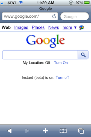 While the feature hit some Android devices about a week ago, today it has arrived for the iPhone as well. I’ve just loaded up google.com on my device and sure enough, right below the search box and location indicator, there’s an “Instant (beta) is on: Turn off” message. It’s sort of interesting that the feature is opt-out, even on mobile (Update below). Though I have to assume that if your connection is slow, they’ll revert to regular Google search just as they do in the browser itself.