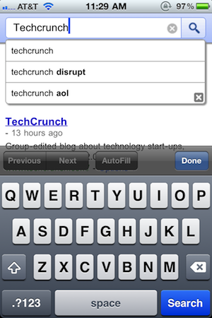 So how does it work? Similar to it does in a regular web browser, but it’s a bit odd since the drop-down search suggestions take up a lot of screen real estate and so does the on-screen keyboard. You can still see the results being populated as you type, but barely (see below).