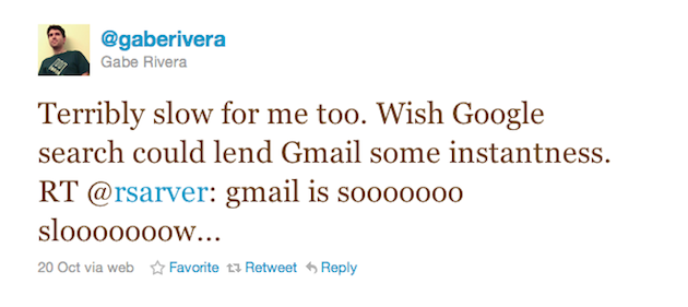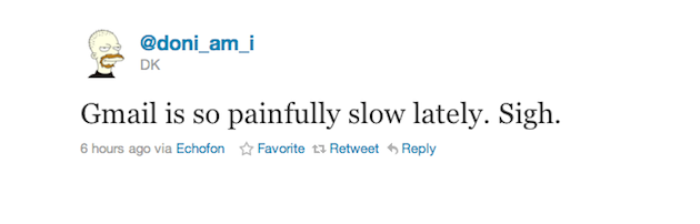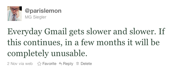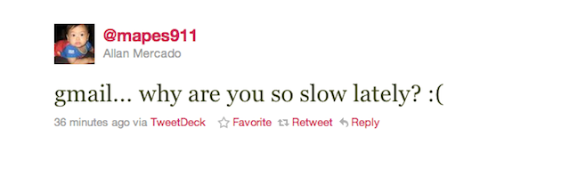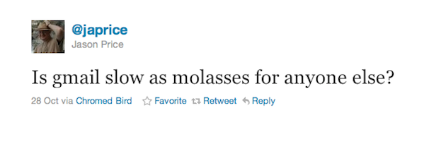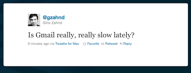 I thought it was maybe just me when I tweeted a couple days ago about awful Gmail performance recently. But it’s not just me. Dozens of people responded to me about that tweet. I tweeted about it again earlier today and dozens of other people responded. Some quick Twitter searches reveals many others noticing the same thing: sometime in the past couple of weeks, something has happened that has made Gmail almost unbearably slow.