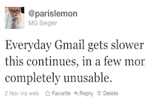 It seems to be particularly bad when I first start up Gmail in the morning. Then it often gets better. Then it gets worse again. A number of people I’ve spoken with have noticed the exact same thing — including at least three of my colleagues here at TechCrunch. Opening an email can take upwards of 30 seconds to a minute. Sending one is even worse. And don’t dare try to do an email search when Gmail is acting up.