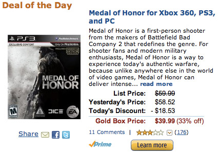 The “deal of the day” is Medal of Honor, EA’s, well, so-so attempt to take on the almighty Call of Duty franchise. The game is $39.99 today, down from $59.99. I’d be shocked if you’d be able to find the game for a better price than that.
