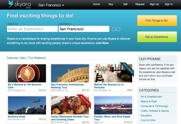 i/o Ventures backed Skyara launches today as a marketplace for exciting things to do. Founded by Jonathan Wu, Dennis Liu and Steven Ou, the site provides people who can offer new experiences like a culinary tour, personalized yoga or a beer tasting with a platform to do so, hooking them up AirBnB-style with people who seek new experiences like foodies or yoga fanatics.