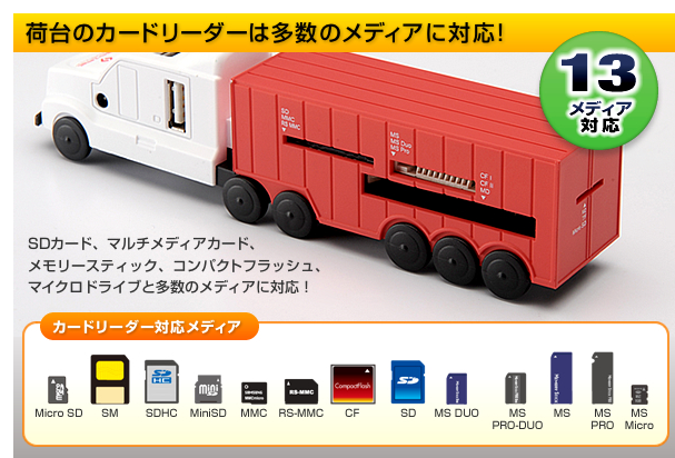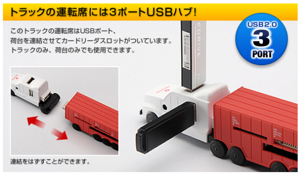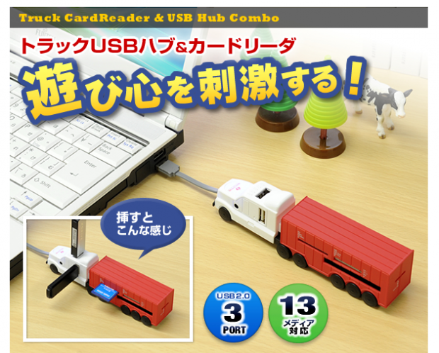 I wonder why USB specialist Thanko has never thought of this cool card reader and USB hub combo [JP] that looks like a toy truck. The gadget offers a total of three USB 2.0 ports and supports 13 different cards, from microSD to CF cards.