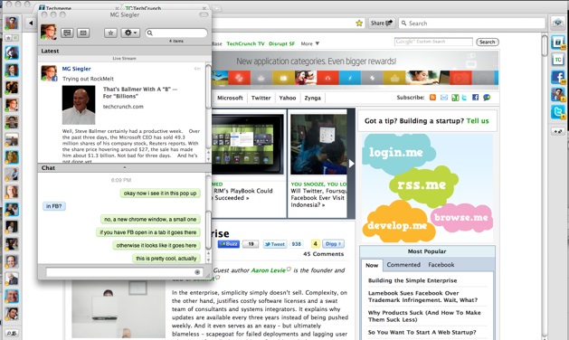 RockMelt is built first and foremost for sharing. You browse with your friends (the first thing you do is log into Facebook and your favorite friends and their latest status updates are always available along the left rail). And there is a big “Share” button up top, which lets you share any webpage, along with images and a preview, on Facebook. You could call it a Facebook browser, but it really is more than that. I’ll get into my full review shortly, but if you want to try out RockMelt for yourself, be one of the first 500 TechCrunch readers to click this link—Update: link removed because the invites are long gone—and you will get an invite before anyone else).