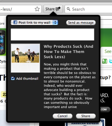 Along the right rail is where you organize all your news feeds and streams from your favorite sites. This is kind of like a bookmark bar, but when you save a site here, it also includes notifications every time new content has been added. This is very convenient for news sites, blogs, Gmail, Twitter, and your own Facebook profile. (See screenshot below). Click on a site icon, and you up pops an overlay window with an RSS feed with all the articles, or Twitter stream, or your email headlines, depending the site. Click on a headline and it takes you to that page (or email or Tweet) in the main underlying browser window. There is also a share button for every feed item, which works just like the big share button up at the top of the browser.