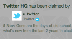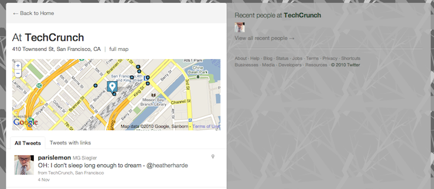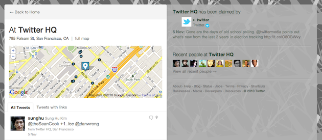 We’re not entirely sure how new this is, and have reached out to Twitter about it (update below). But what’s interesting is that it appears that Twitter’s headquarters is the only venue that has been claimed so far (by @twitter, naturally). And looking over the site, I can’t find a way to claim any other venue. Here’s the TechCrunch headquarters, for example, unclaimed.