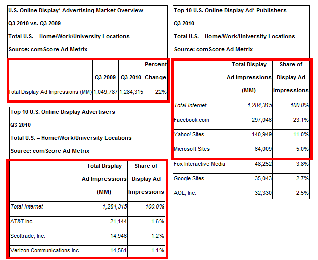 For the record, comScore data for display advertising units includes both static and rich media ads but not video ads, house ads and tiny ads (less than 2,500 pixels in dimension).