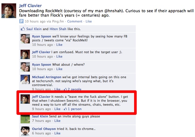 Some people can’t handle all the notifications. For instance, VC Jeff Clavier wants a leave me the f%$k alone” button, or some way to “turn off all the streams, chats, tweets, etc.” I don’t find it particularly daunting. Maybe he just needs to turn off Growl.