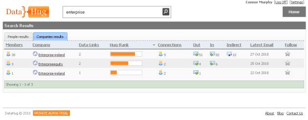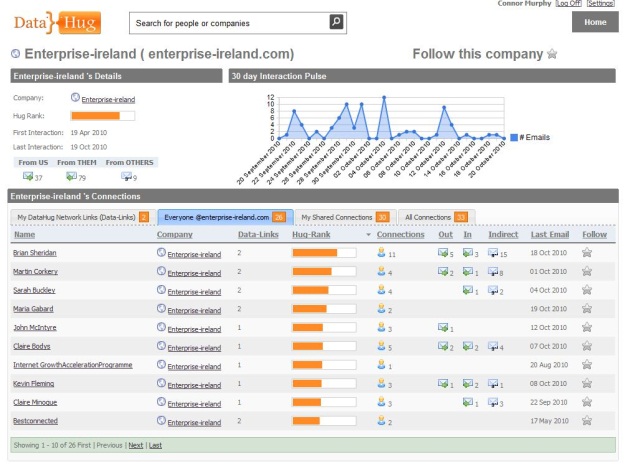 Founded in late 2009 by former consultants Connor Murphy and Ray Smith, DataHug essentially enables clients to “better understand and exploit” the collective company network. Or as one of the judges at the startup competition put it more eloquently: it’s like “LinkedIn on steroids as it not only answers who knows whom, but also how well they know them”.