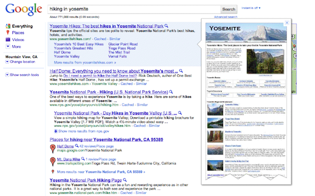As apparently hundreds of you have already seen, Google Instant Previews allows you to see what’s on a website right from a Google Search results page. All you have to do is simply click the little magnifying glass icon next to a result and an overlay will appear to the right of the link, showing you what’s on the page.