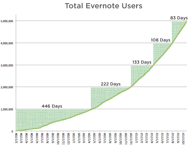 In other words, the time to add another million users keeps getting shorter for Evernote (22,130 users signed up yesterday, the company claims).