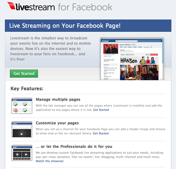 Says Facebook’s Erin Kanaley, “We have seen a growing need by brands and artists wanting to live stream inside their Facebook page to engage their community. While we are platform agnostic, we are excited to see Livestream deploying the first self-service application to enable live streaming within Facebook pages”