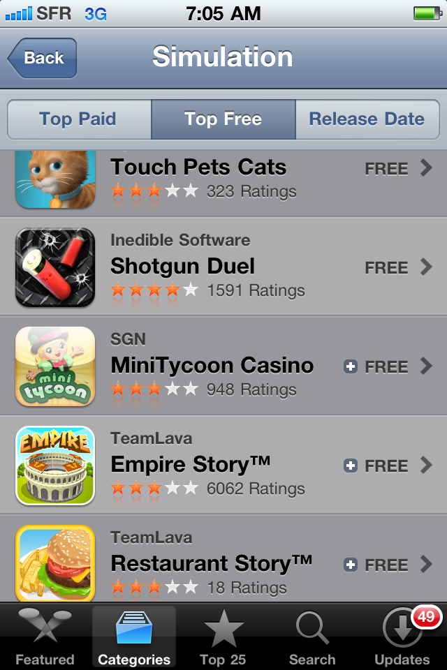 Less than a week after its global launch, MiniTycoon Casino, is now the number one mobile social game on the iPhone ahead of the real social games including Empire City, TapZoo, Restaurant Story and Farmville. This is SGN’s first pure social game on the iPhone and iPod Touch. No doubt as a result of its social features, it’s also now the number one casino game, although you don’t bet real money but instead purchase virtual goods to pimp out your place, Soprano like.