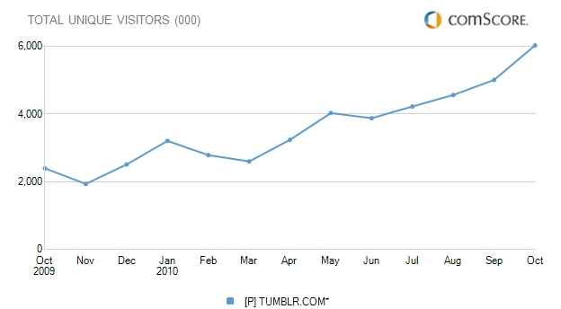 Sometime last June, blogging service Tumblr hit an inflection point. It’s visitors and pageviews just took off. According to comScore, Tumblr served up 1.2 billion pageviews in the U.S. in October, up a mind-boggling 1,540 percent from the year before (see chart above). Unique visitors from the U.S. hit 6 million, up 150 percent (see chart below). Worldwide visitors in September were around 14 million.