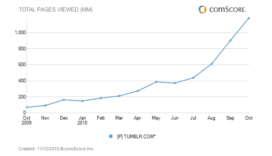 But something definitely started to click this summer. As you can see by the charts, that is when growth really took off. U.S. pageviews were only 373 million back then. In August, it passed its one billionth cumulative post. All those posts add up. The more people who use the super-easy blogging service (there are nearly 9.7 million different Tumblogs now), the more overall readers the platform attracts, which creates a virtuous cycle of more publishers.