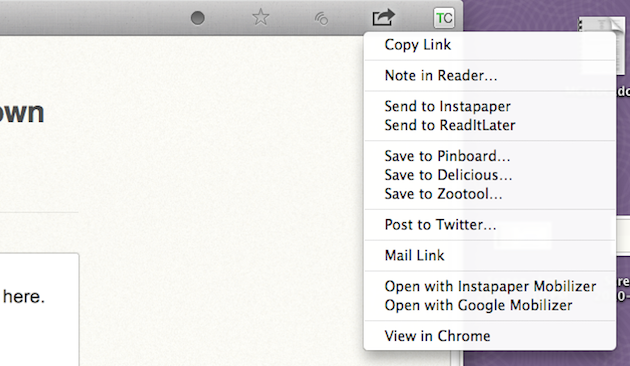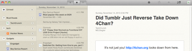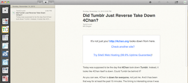 The third (right) pane is where the content is actually shown. Again, with all the proper Mac styling, it just looks a lot nicer than Google Reader does in the browser. And here you can easily do things like star, share, make a note (tied to Google Reader), send to Instapaper (or Delicious, Pinboard, etc), and post to Twitter. The last bit opens a nice little tweet box that allows you to easily insert the title of what you’re reading and/or a link. This third pane can also be used to view the items as they appear on the web itself — and it’s actually a pretty nice way to browse. Or you can hit the “B” button and open any item in Chrome.