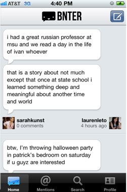 In some isolated cases such as the infamous Tiger Woods-mistress texts, SMS messages are not meant to be shared. But more often than not, SMS messages with friends can actually be fairly entertaining. Launched by Texts From Last Night co-founder Lauren Leto and Patrick Moberg, Bnter is a simple way for people to share text messages with their friends in a profile on the web. The startup had previously rolled out its web application a few weeks ago, but is taking its text sharing mobile with the launch of a free iPhone app today.