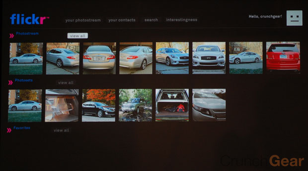 Flickr forces you to the web where you must activate the service in your user settings. While you’re there, you may as well turn on Facebook, Twitter, and others. Boxee is all about sharing after all. But once the Flickr setting is activated, the app launches and brings your photostream to the Boxee Box. It’s not nearly as fluid as viewing pics off of a local source, but the experience is satisfying enough that users may just log into here rather than locating photos to share on networked devices.