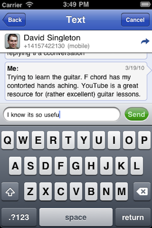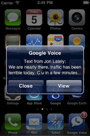 You can also send and receive texts from the app. And you can listen to your Google Voice voicemails — and yes, all of them are transcribed for you to read in the app. And all of this works with the iPhone’s Push Notification system.