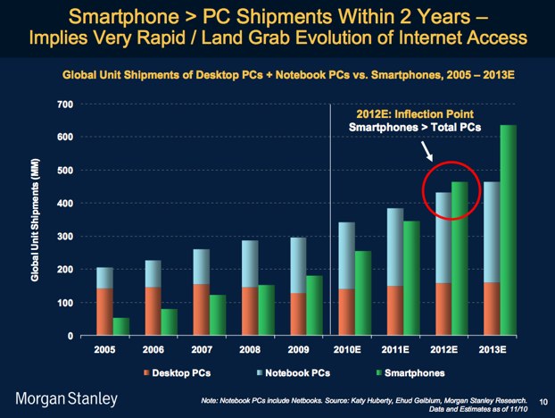 Every year at the Web 2.0 Summit, Mary Meeker gives a ten-minute slideshow packed with great data showing the monetum and direction of different Internet trends. This year, a big focus of her presentation was on mobile. Specifically, she put up the slide above showing a Morgan Stanley estimate that global smartphone shipments will eclipse PC shipments in 2012, with more than 400 million smartphones expected to be shipped that year, compared to less than 200 million last year.