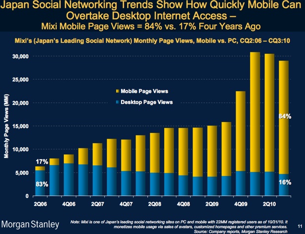Add Android in there and combined with Apple’s iOS, those two platforms now account for 42 percent of smartphone operating systems shipped in the third quarter of 2010. What does this mean for the Web? Meeker extrapolates from the experience of Japan, where social networking on mobile devices rapidly took over from the desktop about three years ago and now accounts for 84 percent pageviews for Mixi, Japan’s largest social network. Will the same thing happen in the U.S. to Facebook? Facebook is certainly preparing for that eventuality.