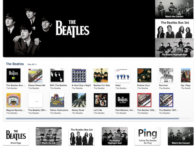 If you load up iTunes this morning, you’ll also see that The Beatles have basically completely taken over the store as well. The front page has a giant banner for the band, and under that are the individual albums, all of which you can buy for $12.99 each (or $19.99 for double albums). Individual songs are the high-end $1.29 a piece. Or you can buy the entire box set of Beatles albums for $149. That includes their Past Masters collection and a live concert film from 1964 — the band’s first U.S. concert.