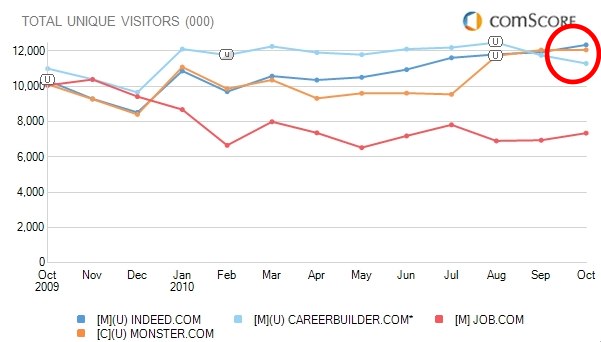 In October, Job search engine Indeed.com slipped past Monster.com to become the largest job site in the U.S. According to comScore, 12.3 million people visited Indeed in October, up 19.6 percent. Monster.com attracted 12.1 million people, and CareerBuilder.com came in third with 11.3 million job seekers. It is still pretty close, with Indeed just barely edging out Monster. But this could very well be a turning point for leadership of the online job search category.
