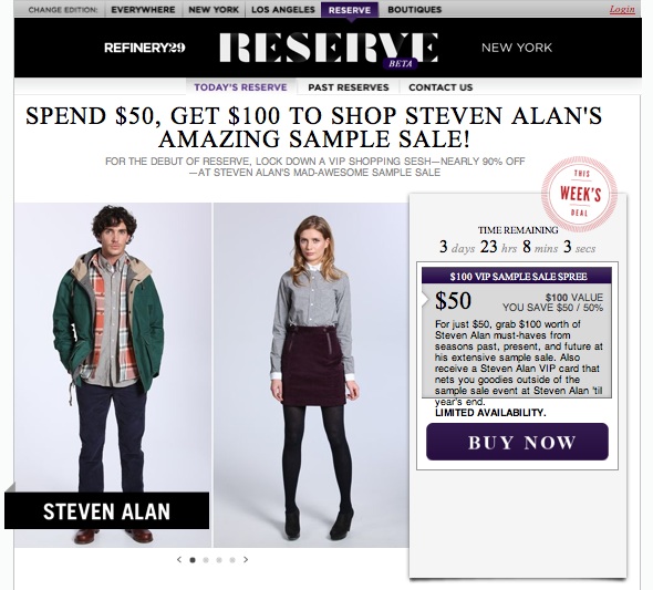 The first Reserve deal is from New York City designer Steven Alan, who according to Borries is “like a young Tommy Hilfigger or Ralph Lauren.” (I’m sure). People who sign up on Refinery29 Reserve can get a voucher worth $100 at one of Steven Alan’s six New York City boutiques for $50, essentially getting 50% off a $100 purchase. Refinery29 takes a cut of that $50 (typically 35% to 50%), and Steven Alan gets fashionista fanatics (Refinery29’s readers) going to his stores. After only one day, the deal is already three-quarters sold out.