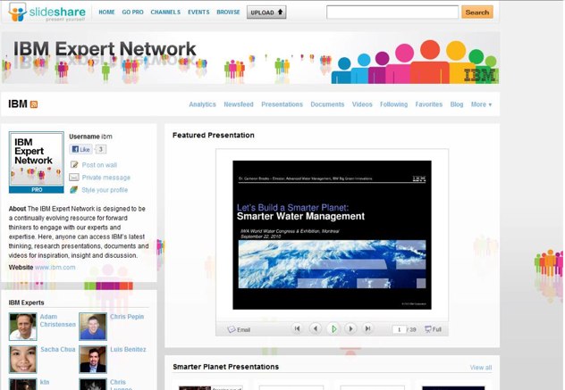 SlideShare lets anyone share presentations and video and also serves as a social discovery platform for users to find relevant content and connect with other members who share similar interests. IBM is launching as a pilot partner for the Company Networks feature, with the IBM Expert Network. The page shows all of the IBM employees or experts on Slideshare page as well as content that is curated from each expert’s profile. Slideshare also allows users to feature particular presentations more prominently and categorize content from employees.