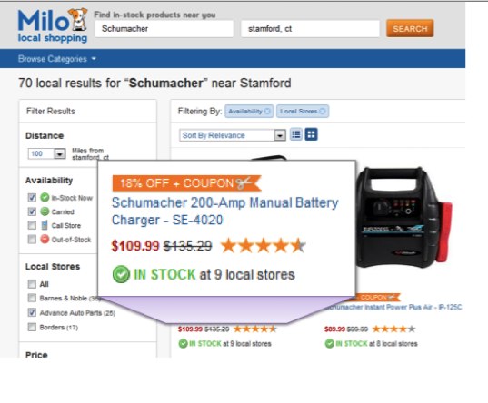 Startup Milo had previously commanded one aspect of the online to offline shopping experience by highlighting local inventory at brick and mortar stores in online inventory search. But earlier this year, Google Product Search launched Blue Dot, on mobile search. Similar to Milo, Blue Dot allows users within search to see if a product is in-stock at nearby stores. However, Milo countered back then that Google doesn’t have the inventory reach that Milo has. This week, Google unleashed a new version of Product Search, with more inventory listings from 70 retail brands. And today, Milo is striking back by adding coupons to the mix.