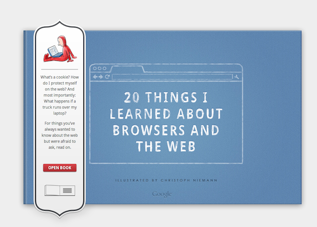 In what they’re calling a throwback to the original comic book they released to announce the launch of Chrome, Google has today unveiled a new site meant to educate users about browsers and the web. 20 Things I Learned About Browsers & The Web is actually an interactive web app meant to look like a children’s book. And while the book’s content is all about web technology, the interactive book itself shows off some of that technology as it’s built entirely in HTML5. And it’s very slick.