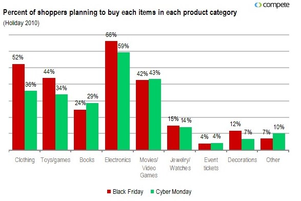Compete says the increased spend is likely due to more people shopping for high-end items such as electronics, clothing, toys and games on Black Friday than on Cyber Monday. The report shows that 11%, 32% and 23% more people will shop for these items, respectively, on Black Friday than on Cyber Monday.
