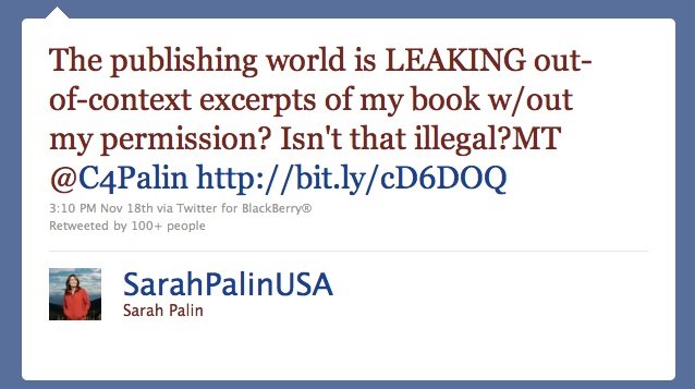 Nonetheless, never let it be said I don’t listen to my critics. The next time I write anything about Sarah Palin (who, for the avoidance of doubt, I dislike intensely), I’ll make sure there’s a totally iron-clad justification for it to appear on TechCrunch. Like if, for example, she uses Twitter to prompt her publisher to take legal action against a hugely popular gossip blog for reposting extracts from an electronic copy of her new book. Which she’s been heavily promoting through social media.