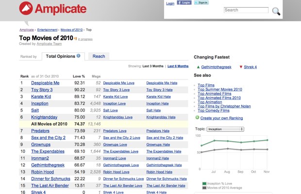 You can find out in realtime what are the top movies, car brands, mobile phones, tech blogs, or even vegetables people are talking about on Twitter and Facebook. (Blogs and other opionionated data sources will be added soon). People apparently love pumpkins right now (I wonder why). You can also add your own opinion to the site and vote up the best opinions, and chart the sentiment of any give keyword against the average for that topic.