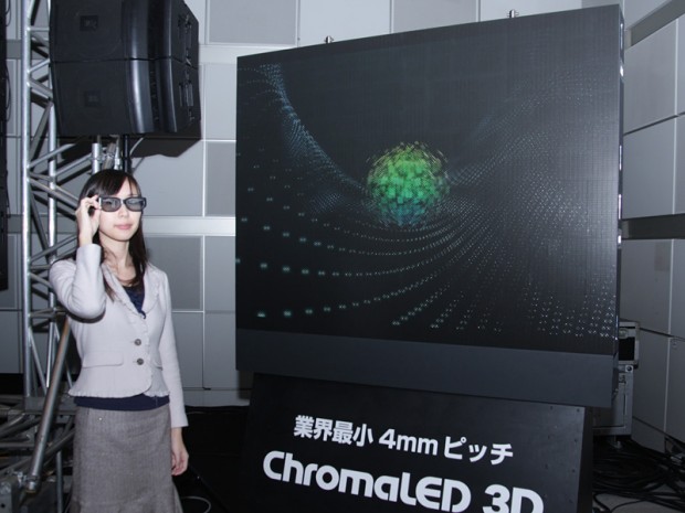 Another day, another 3D-related news item. I guess you never heard about Hibino, but the Tokyo-based electronics company has shown two interesting new products [JP, PDF] today. First, there’s the ChromaLED 3D6, a LED-based display system that’s sized at a whopping 280 inches (pictured above) and that can produce 3D images.