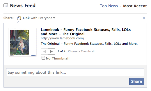 Not only is it currently impossible to share a Lamebook link to your News Feed or a friend’s Facebook Wall — you can’t even include them as part of a direct message or email to friends (you get an error message indicating that it’s “abusive or spammy”, which isn’t even accurate). That’s completely outrageous, and it’s a warning flag that comes only a few days after Facebook announced a new hybrid email/IM/SMS product. Do you really want someone to be censoring your outbound email?
