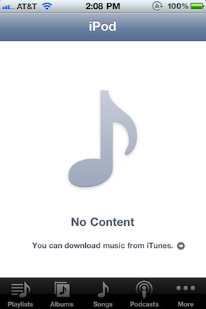 After you update to the new OS, if you load the iPod (Music) app, you may see a message stating that your currently have “No Content” on the device. The problem is that many people do. For example, I have 7.8 gigabytes of audio on my iPhone, but after the update, none of it could be located. Luckily, there’s an easy fix.