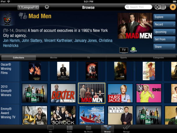 By bringing its best in class high-definition user interface to iPad, TiVo has created a true two-screen TV experience. TiVo Premiere users will get access to a full set of TiVo capabilities on iPad, providing a richer TV viewing experience for both live TV and Internet video while kicking back on the sofa. Plus, users will also be able to schedule and manage their DVR recordings while on-the-go.