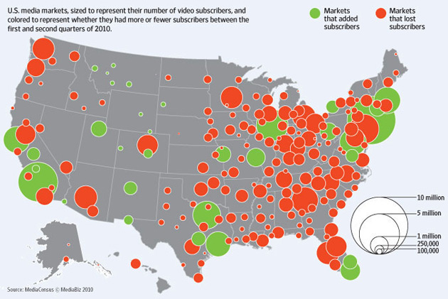 Almighty Giz has two exciting maps that offer an alternative explanation for the decline in cable and satellite subscriptions in the past year. If you look at the maps, you’ll find that the areas that saw the biggest drops in subscriptions are also, generally, the areas hardest hit by foreclosures. The theory goes, these areas have been hard hit by the recession, and subsequent unemployment, so they’d be first to drop superfluous things like $100+ cable TV bills.