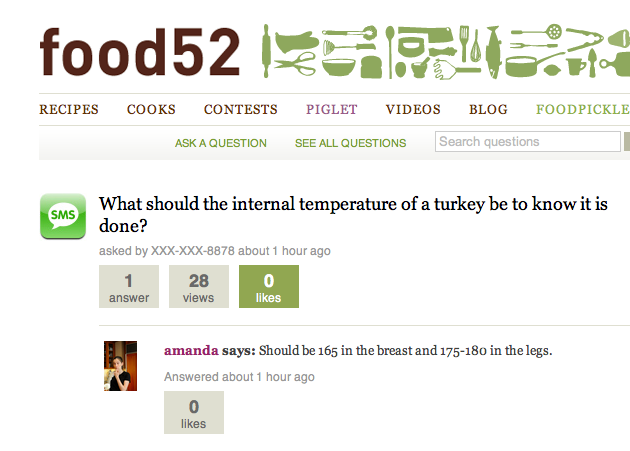 And if you are lucky, your question might even be answered by food writer Amanda Hesser. Food52 is her site which she is using to crowdsource her next cookbook with Merrill Stubbs. It attracts a very active community of cooks. Anyone can answer a question on Foodpickle, and the best answers are voted up. If you stil have any last-minute cooking questions this Thanksgiving, give it a try.