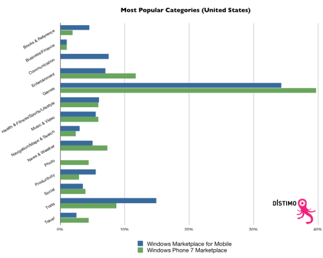 Distimo found that games are far more popular in Windows Phone 7 Marketplace than they are on Windows Marketplace for Mobile (6.x), mirroring the way Microsoft positions Windows Phone 7 as a more consumer-oriented platform.