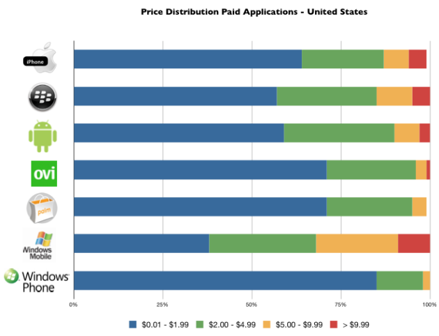 The price of applications in Windows Phone 7 Marketplace closely mirrors the prices in other application stores, with 57% of the 100 most popular apps priced below $2.
