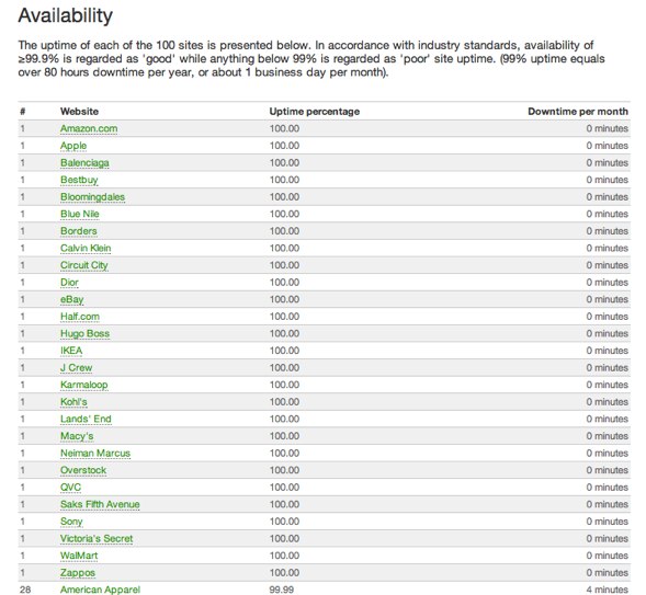 WatchMouse says that 27 of the 100 sites had 100% uptime; 15 came in at 99.99%, and only American Eagle Outfitters, GiltGroupe, Footlocker.com, and Fry’s Electronics landed in the “unacceptable” category. American Eagle Outfitters performed the worst during the monitoring period from October 25 – November 26, 2010 with nearly one full day of downtime.