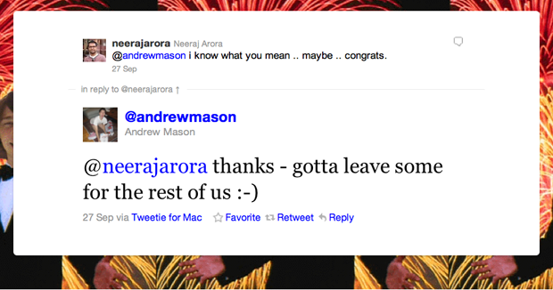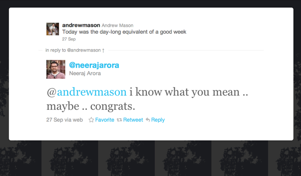 While I’ve contacted both Google and Groupon to no avail, a quick scan down Groupon CEO Andrew Mason’s Twitter account does reveal some interesting activity, namely a vaguely implicit conversation had with Google M&A lead Neeraj Arora back in September.