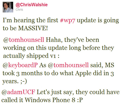 Well, one of the WP7 developers said that Microsoft has done in three months what Apple had done in three years. (Incidentally, Florentino Pérez, president of Real Madrid, said the same thing when he took over the presidency of the club in June, 2009.)